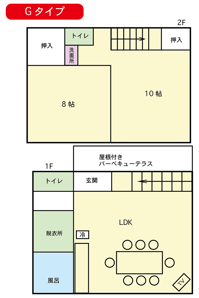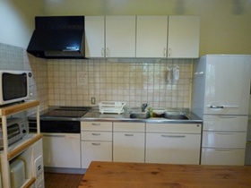 TV、DVDプレーヤー、電子レンジ、オーブントースター、冷凍冷蔵庫、ガステーブル、炊飯器(1升)、電気ポット、洗濯機、包丁、フライパン、鍋、ピーラーなど基本的な調理器具、フォーク、スプーン、箸、茶碗、お皿類、湯呑み、グラス類などの設備を整えております。 |